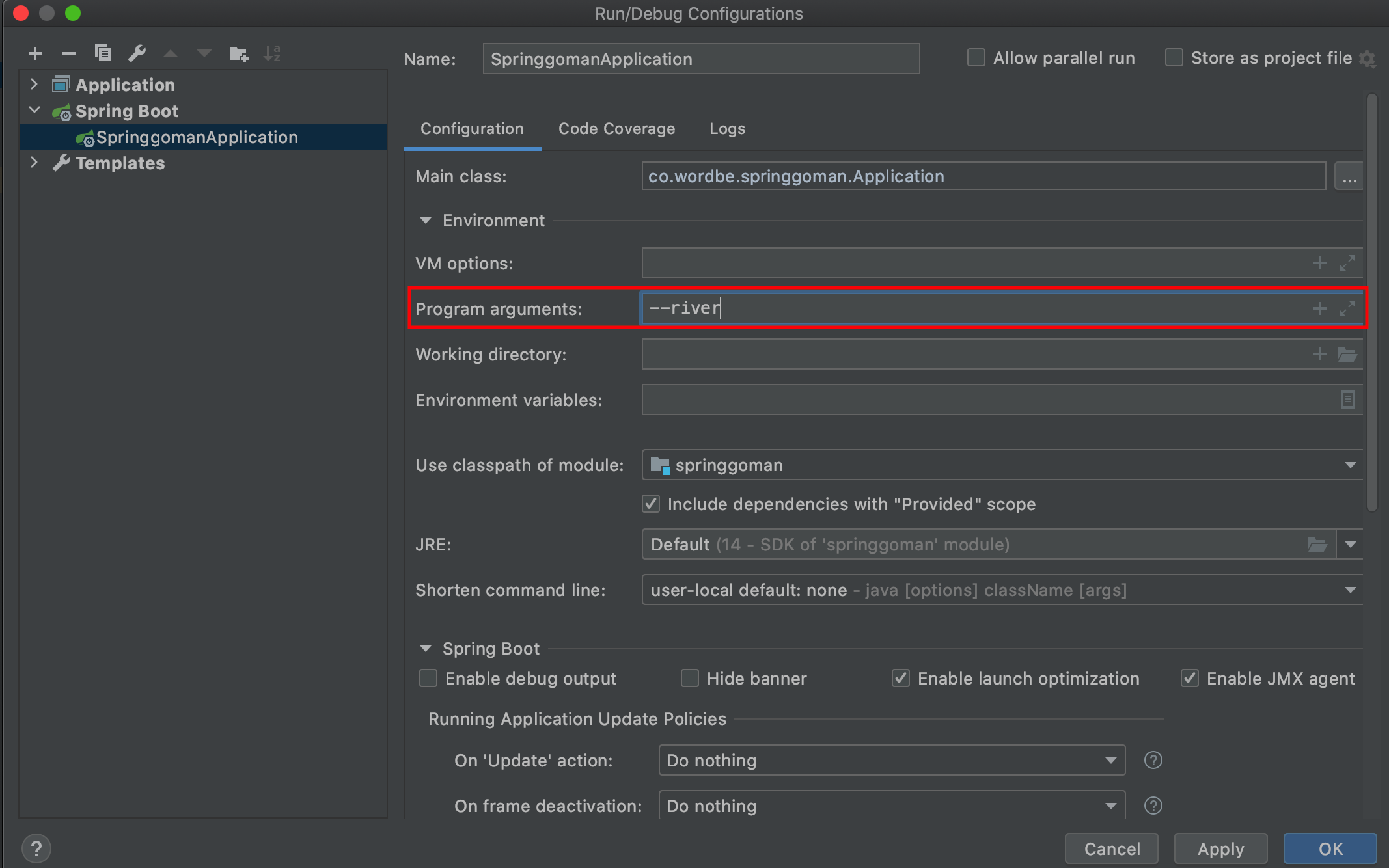인텔리제이에서 Program arguments 에 원하는 아규먼트를 추가할 수 있다.