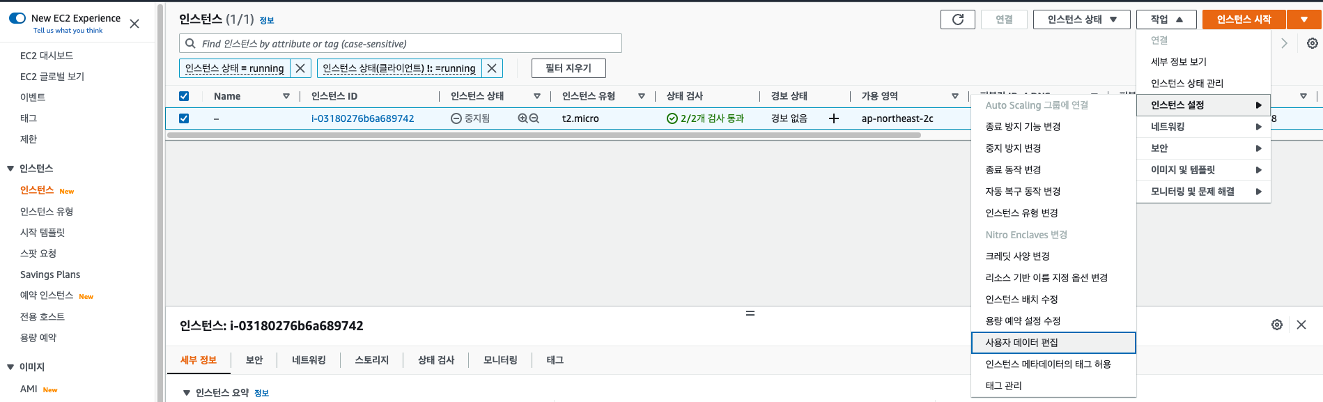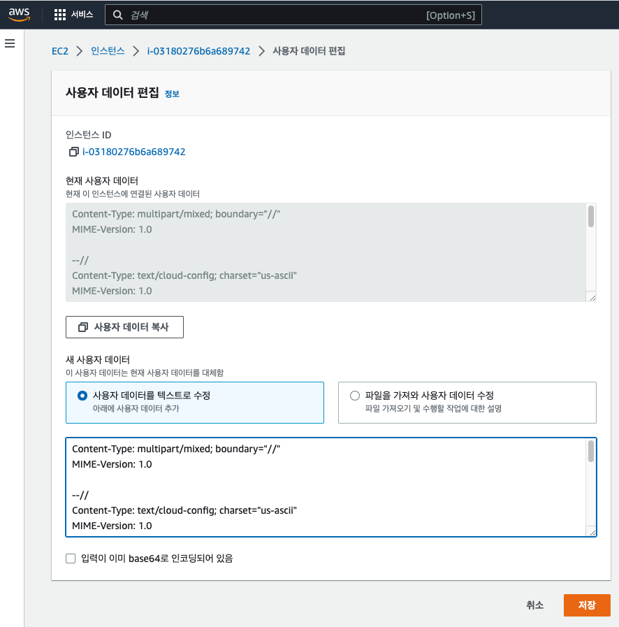 - 작업 > 인스턴스 설정 > 사용자 데이터 편집 에 들어갑니다.