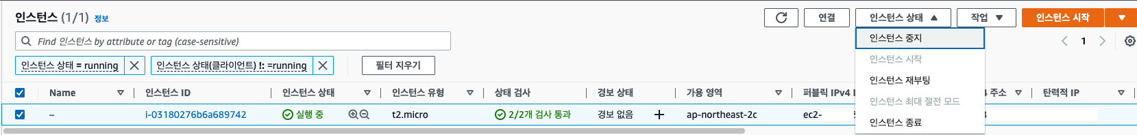 중요한 것은 인스턴스 종료가 아닌 '중지'입니다.