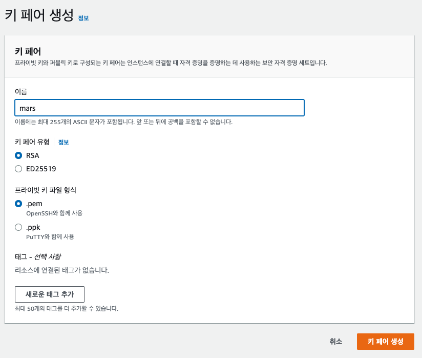 키 페어 생성을 누르면, 자동으로 private key (.pem) 파일이 다운로드 됩니다.