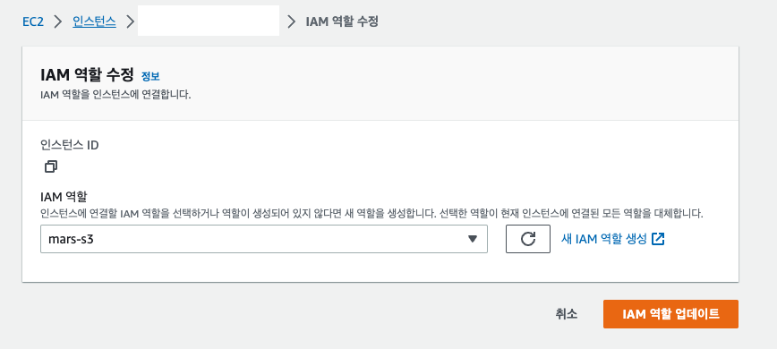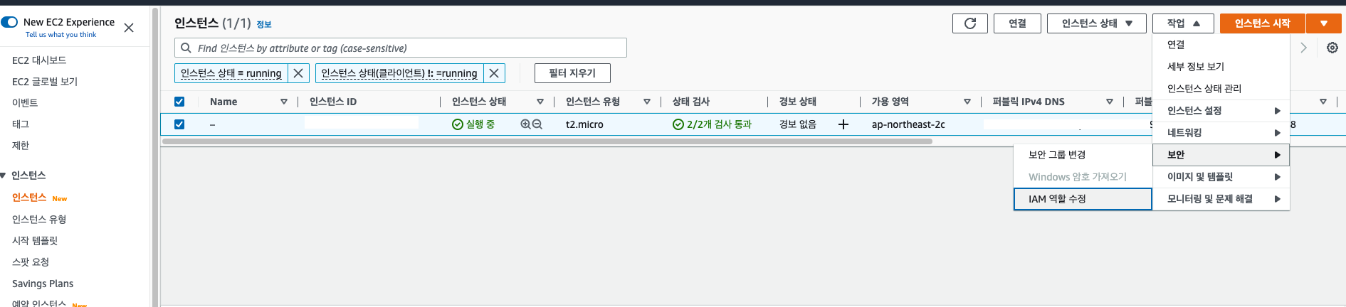 이제 EC2 인스턴스에 가서 인스턴스에 지금 만든 역할을 반영한다.