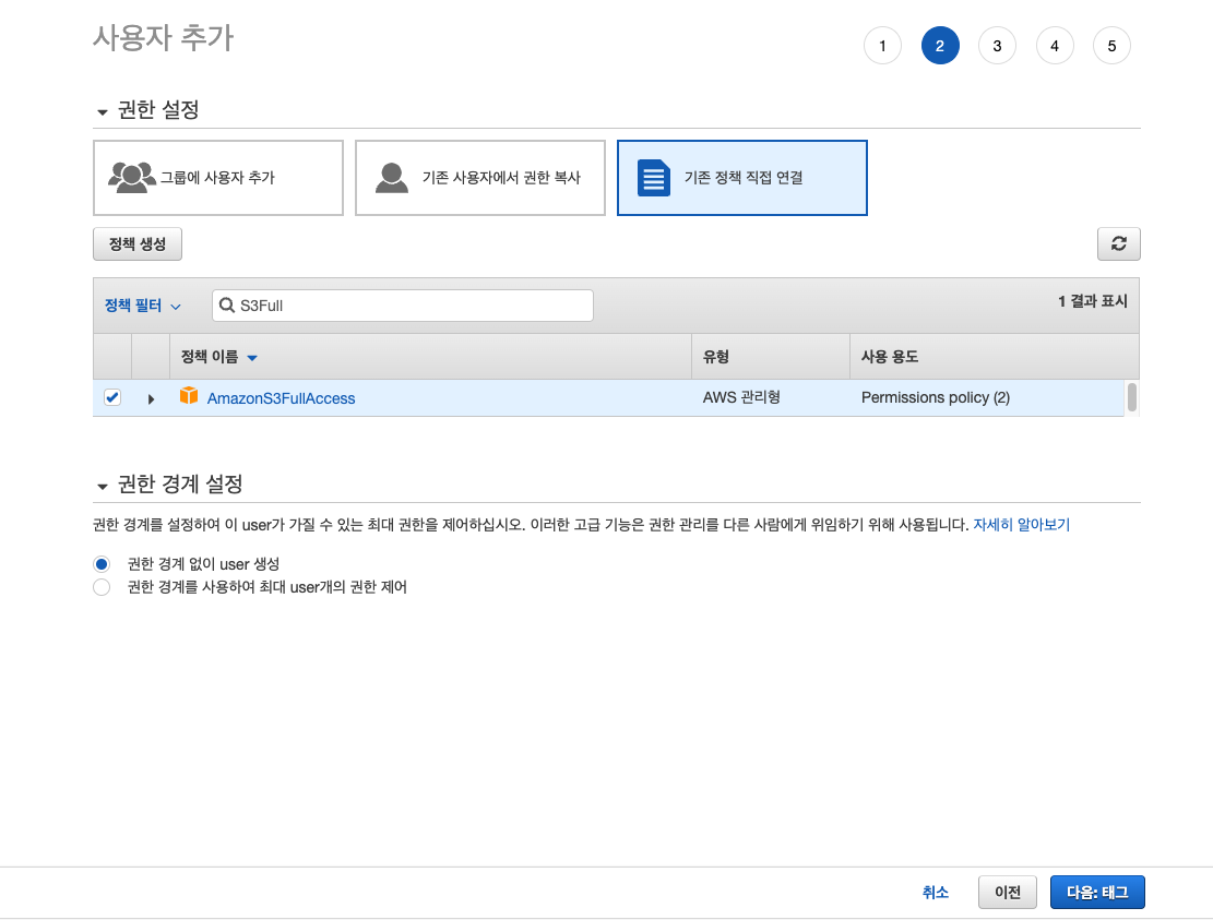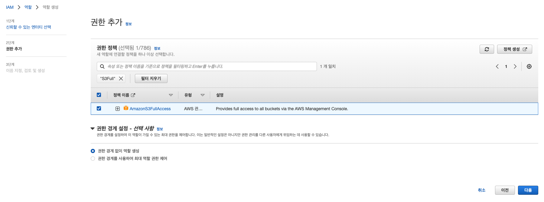 기존 정책 직접 연결을 누르고, AmazonS3FullAccess 권한을 등록한다. S3 의 모든 접근 권한이다.