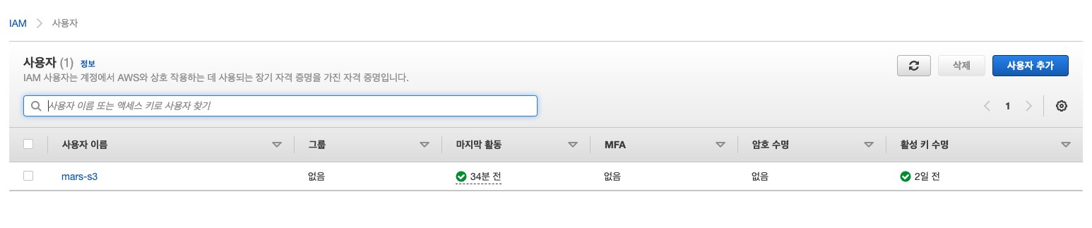 그러면 아래와 같이 IAM 사용자가 생성된다.