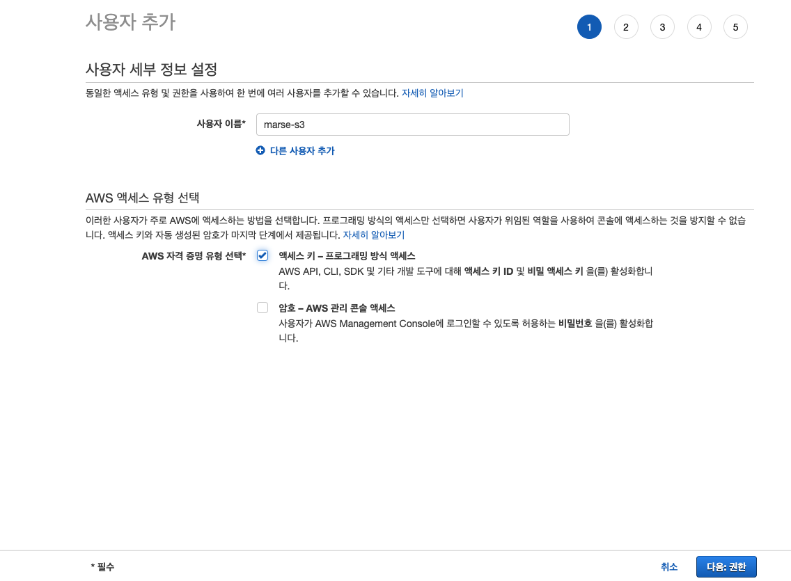 사용자 이름을 정하고, 액세스키 방식을 선택한다.