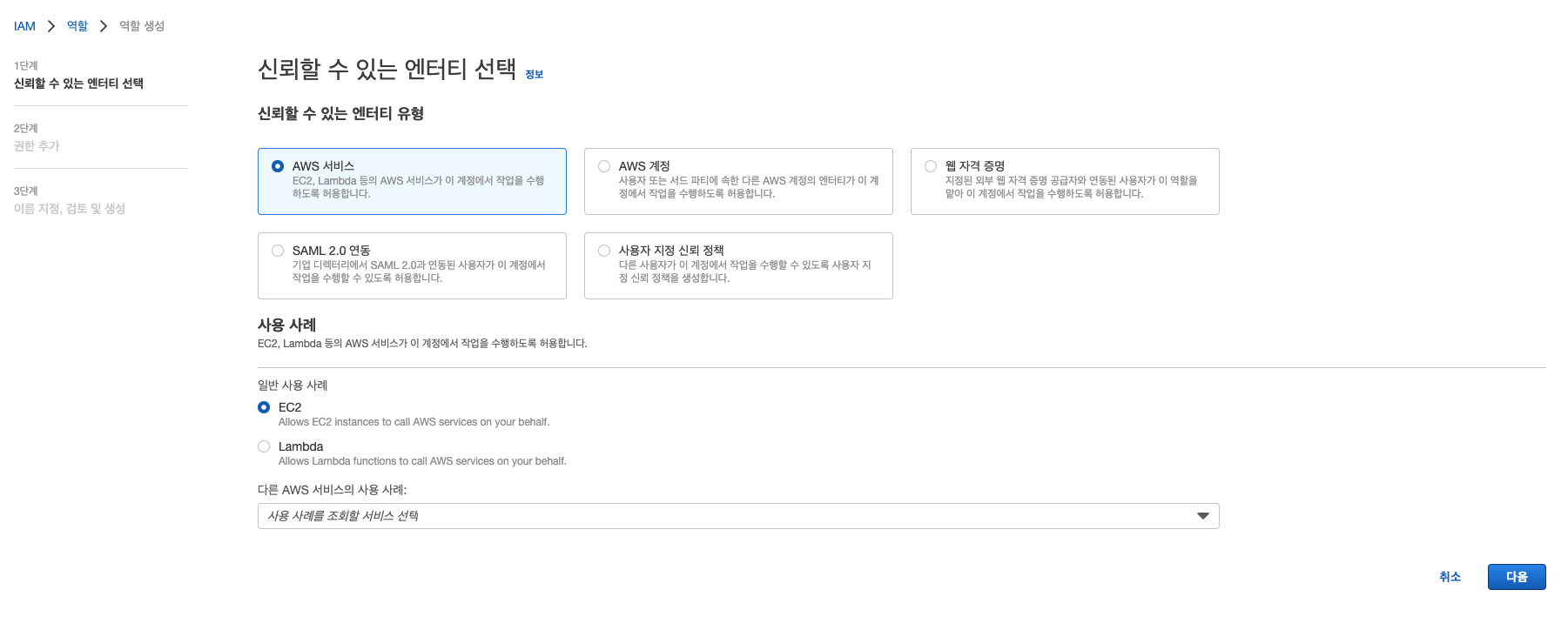 IAM > 액세스 관리 > 역할 > 역할 만들기 버튼 클릭
