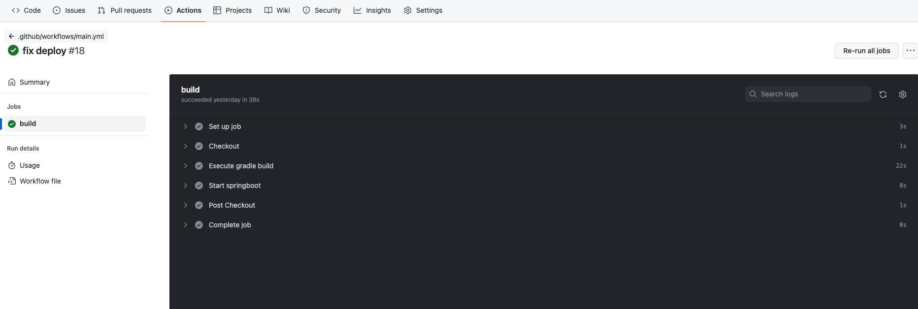 RUNNER_TRACKING_ID=""이 부분을 넣은 이유는 깃헙 액션이 맨 마지막 스텝에 백그라운드에서 실행되는 고아 프로세스를 자동으로 죽이도록 설정해놓았기 때문에, 제가 백그라운드에 실행시켜놓은 스프링부트 서버가 죽는 현상을 막기 위함입니다.- 실행 권한을 부여하고, 해당 스크립트를 실행합니다. 이 때 5분(300초)이 지나면 타임아웃이 되어 종료하게 설정해놓았습니다. 깃헙액션은 1달에 33시간 정도의 무료시간을 제공해줍니다. 이 것이 초과되는 것을 미리 방지하고자 합니다.