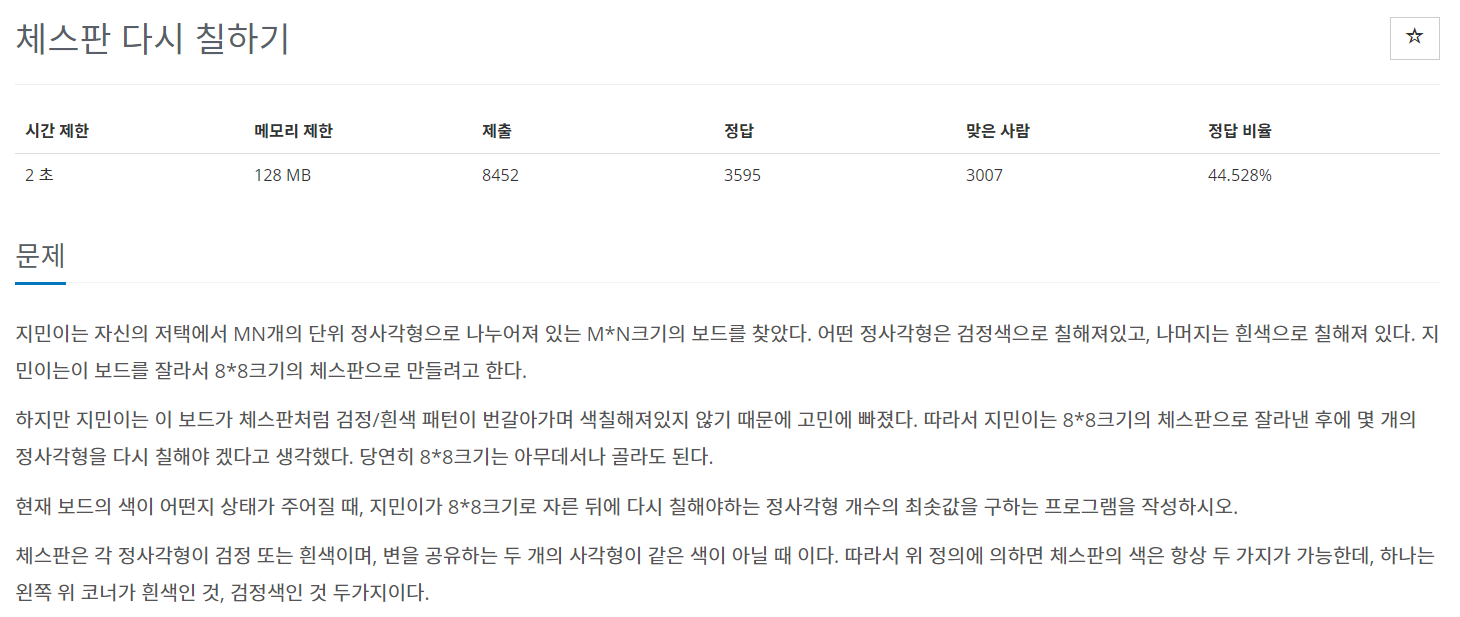 8x8의 크기의 filter로 체스판을 자르고 올바른 체스판으로 만들기 위해 뒤집어야할 횟수 중 최소가 되는 것을 고른다.