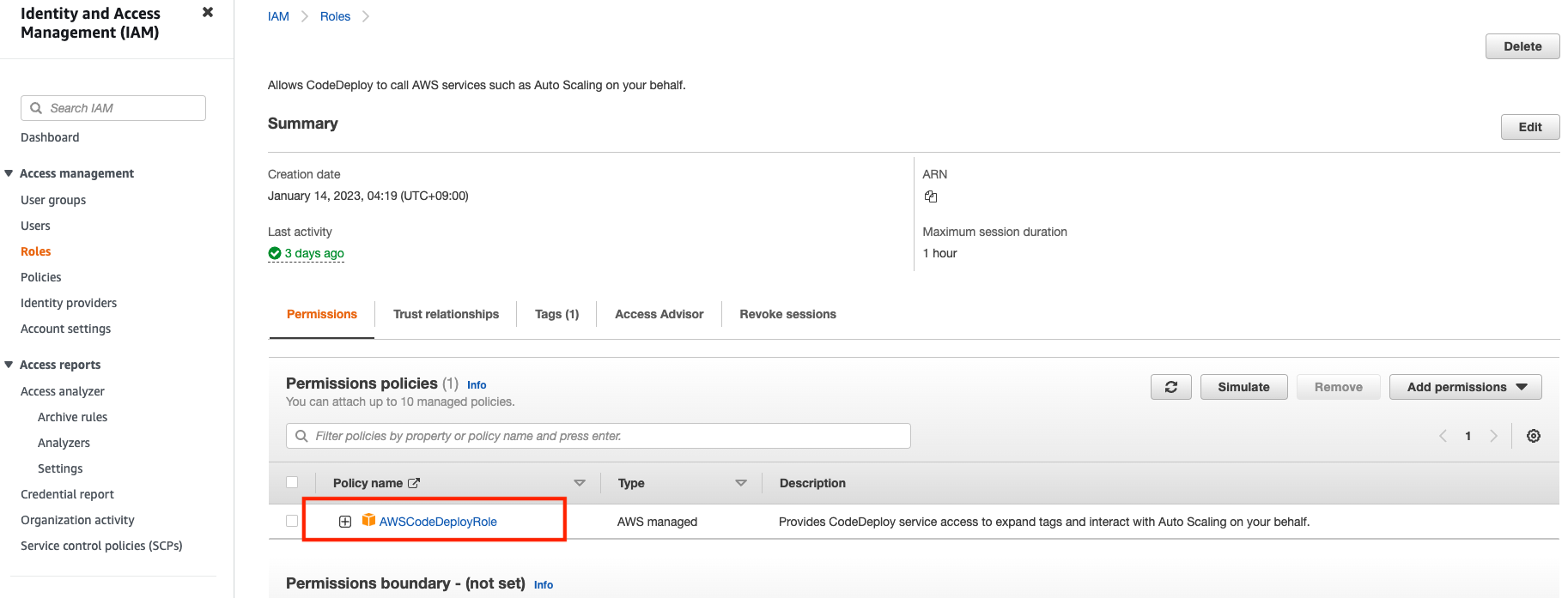 또한 EC2 에 CodeDeploy agent 를 다운받아 사용할 것인데 EC2 에 Roles 를 부여해서 자동 인증하여 CodeDeploy 를 연동할 수 있도록 아래 Roles 를 만들어준다.