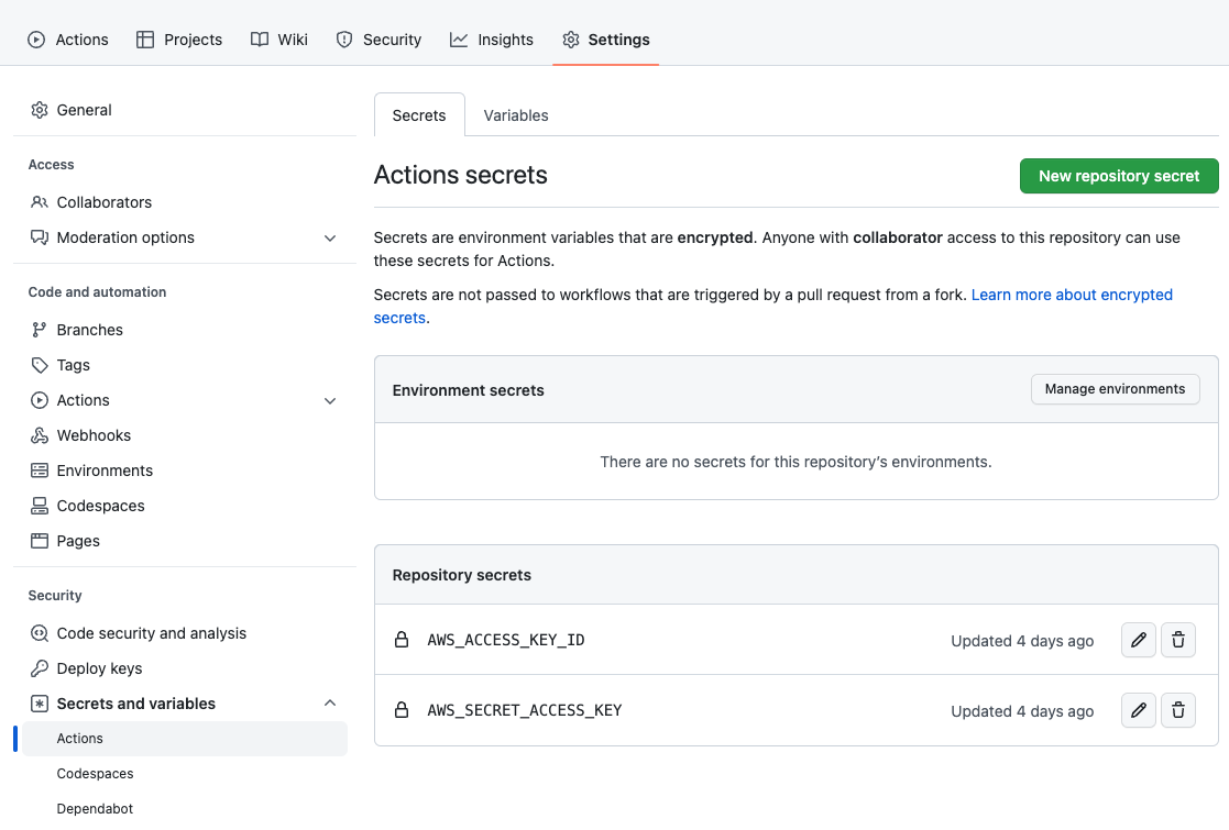 받아놓은 키를 Github > Settings > Secrets and variables > Actions 에 등록해놓는다.
