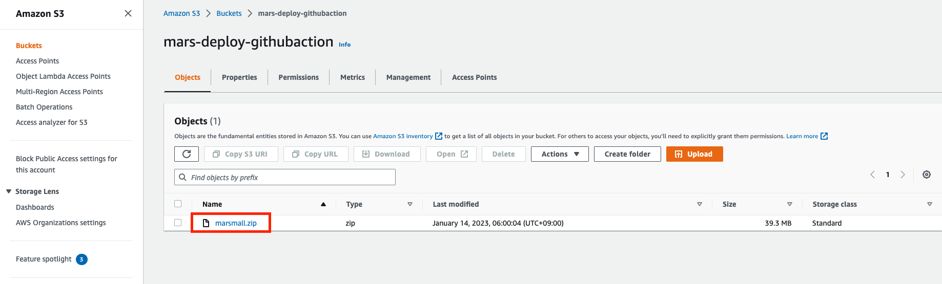 깃헙 액션이 정상적으로 실행된다면, zip 파일이 S3 버킷에 정상적으로 복사될 것이다.