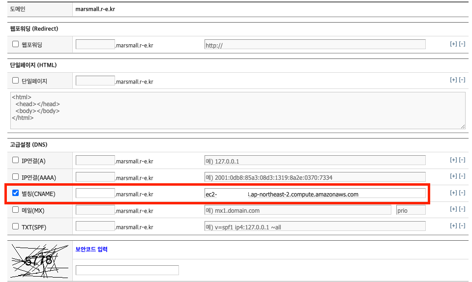 고급설정 (DNS) 에서 A record (Address) 에 직접 탄력적 IP 주소를 매핑하거나, CNAME (Canonical) record 에 EC2 도메인을 매핑합니다.