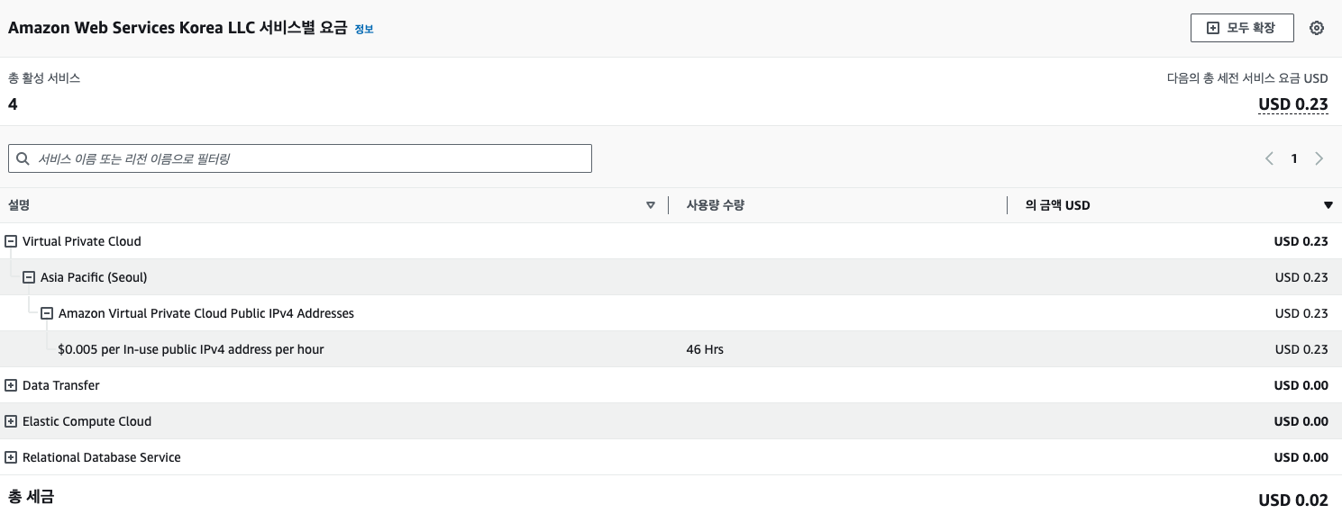 2024.02.01 부터 46시간(= 0.23 / 0.005) 동안 탄력적IP 에 대한 요금이 나온 것이다.