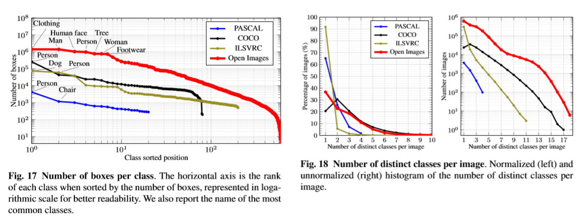 PASCAL, COCO, ILSVRC-Det 데이터 보다 클래스 수, 박스 수, 데이터 수가 압도적으로 많다.