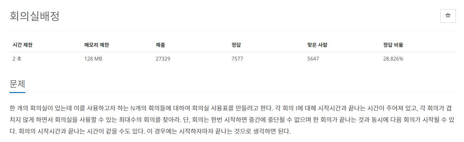 시작 가능한 회의 중에서 '종료시간'이 가장 빠른 것을 그 다음 회의로 배정하는 것입니다.